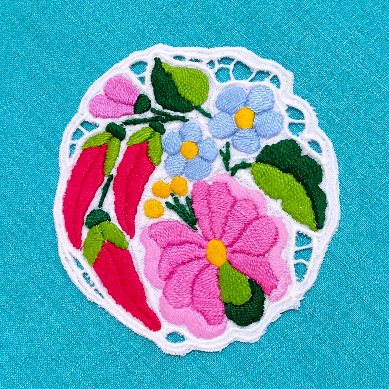 ハンガリーのカロチャの職人による、カロチャ刺繍のレースのコースターです。手刺繍の美しい花々が全体に施されたデザイン、ミシンで編まれた繊細なリシェリュー(レース)が美しい作品です。