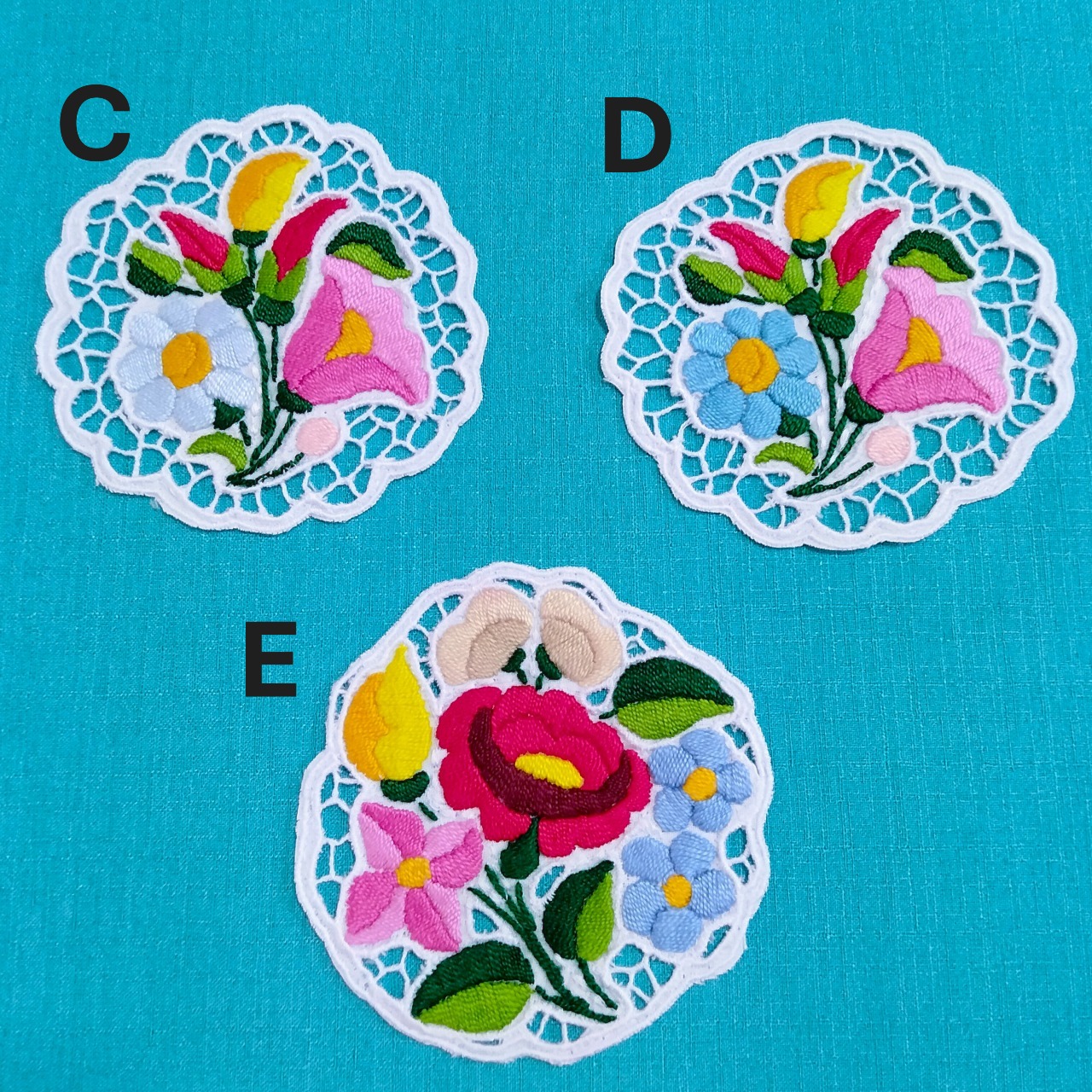 コツカマチカの取り扱っているカロチャ刺繍は、マリアン氏の作る、正真正銘の「カロチャ刺繍」です。コースターサイズの小さなものや、飾りやすいサイズのものを主に取り扱っています。