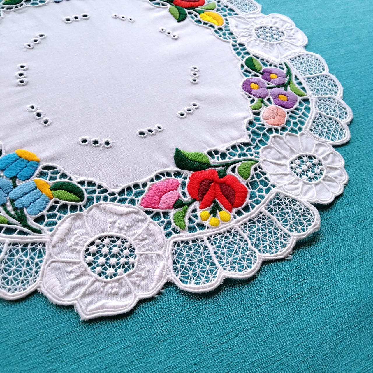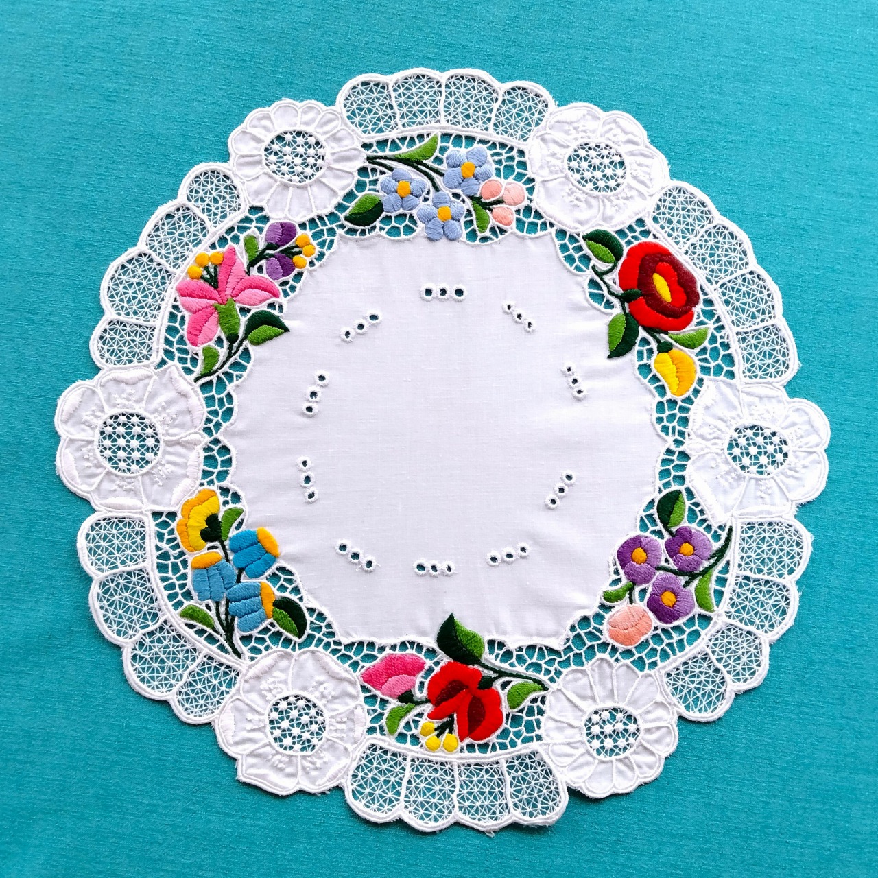 ハンガリーのカロチャの職人による、カロチャ刺繍のサークルドイリー(直径約34cm)です。ファブリック地の中心部を囲むように手刺繍で施されたカロチャ刺繍の花々と繊細なリシェリュー(レース)がたっぷりあしらわれた作品です。
