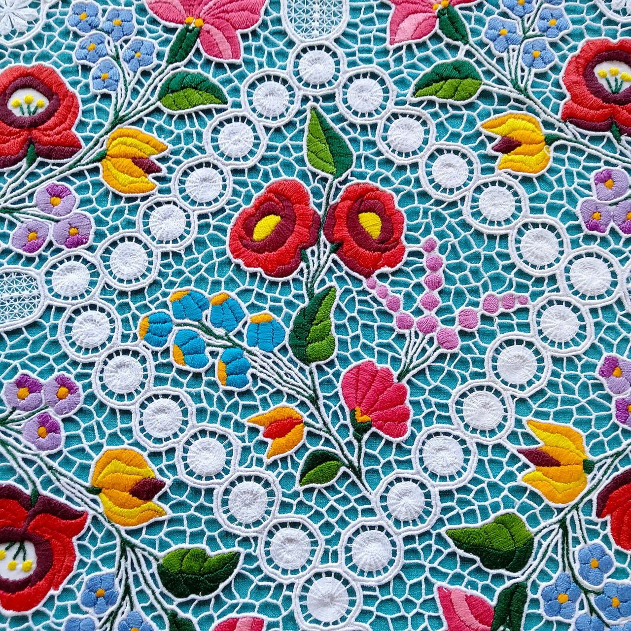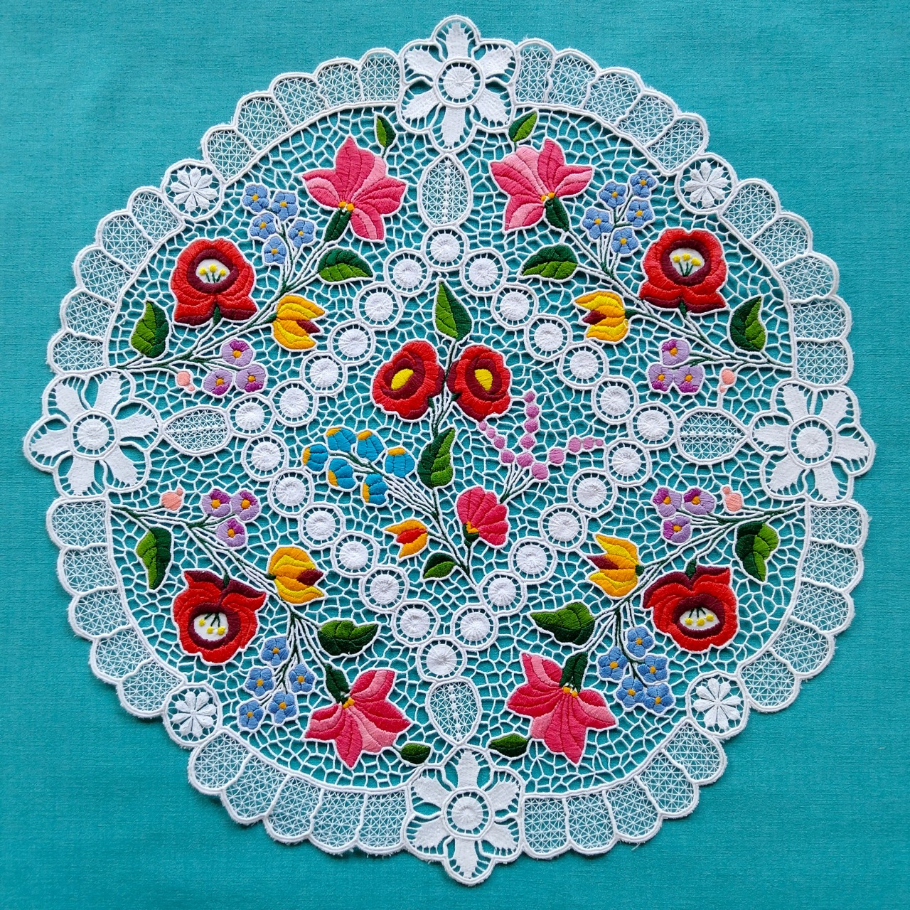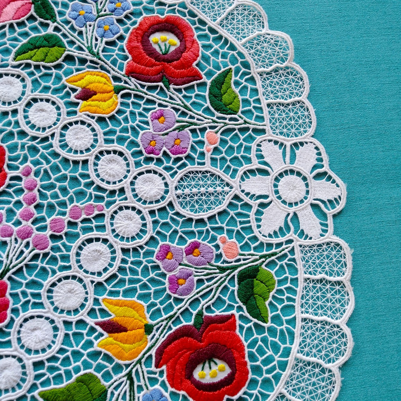 ハンガリーのカロチャの職人による、カロチャ刺繍のレースのドイリーです。カロチャの刺繍に特徴的な赤い花々を中心に、美しいモチーフが手刺繍にて施され、ミシンで編まれた繊細なリシェリュー(レース)が美しい作品です。直径約57cm、大きなサイズの希少な一品です。