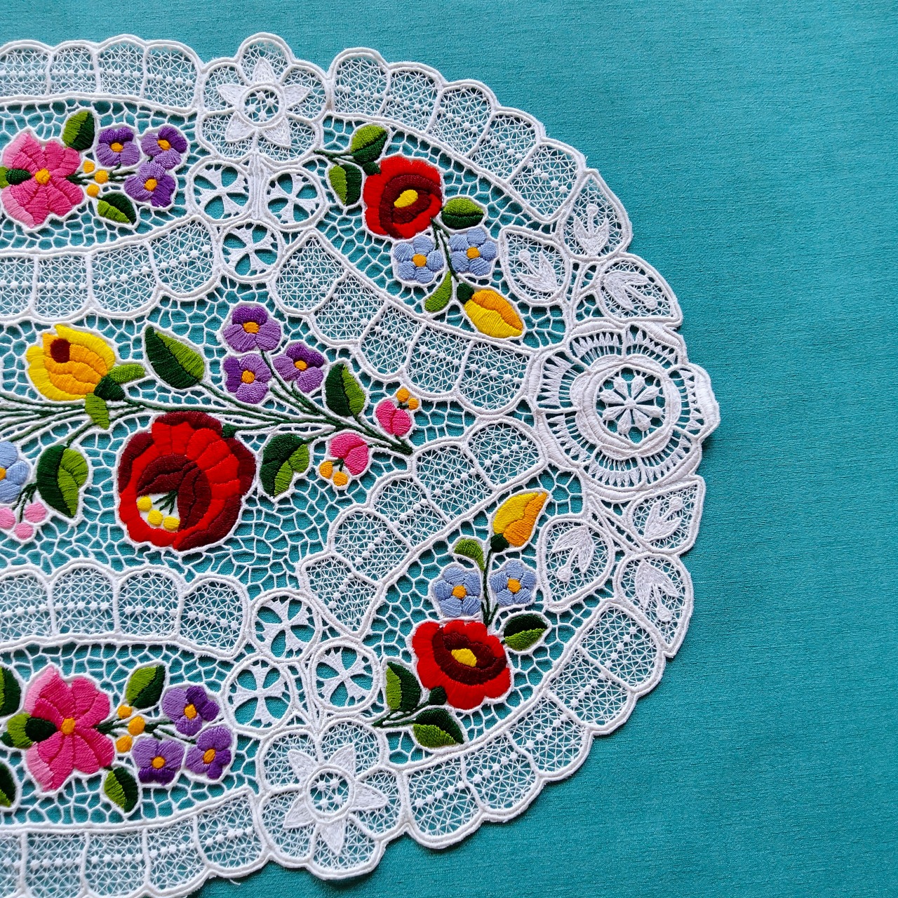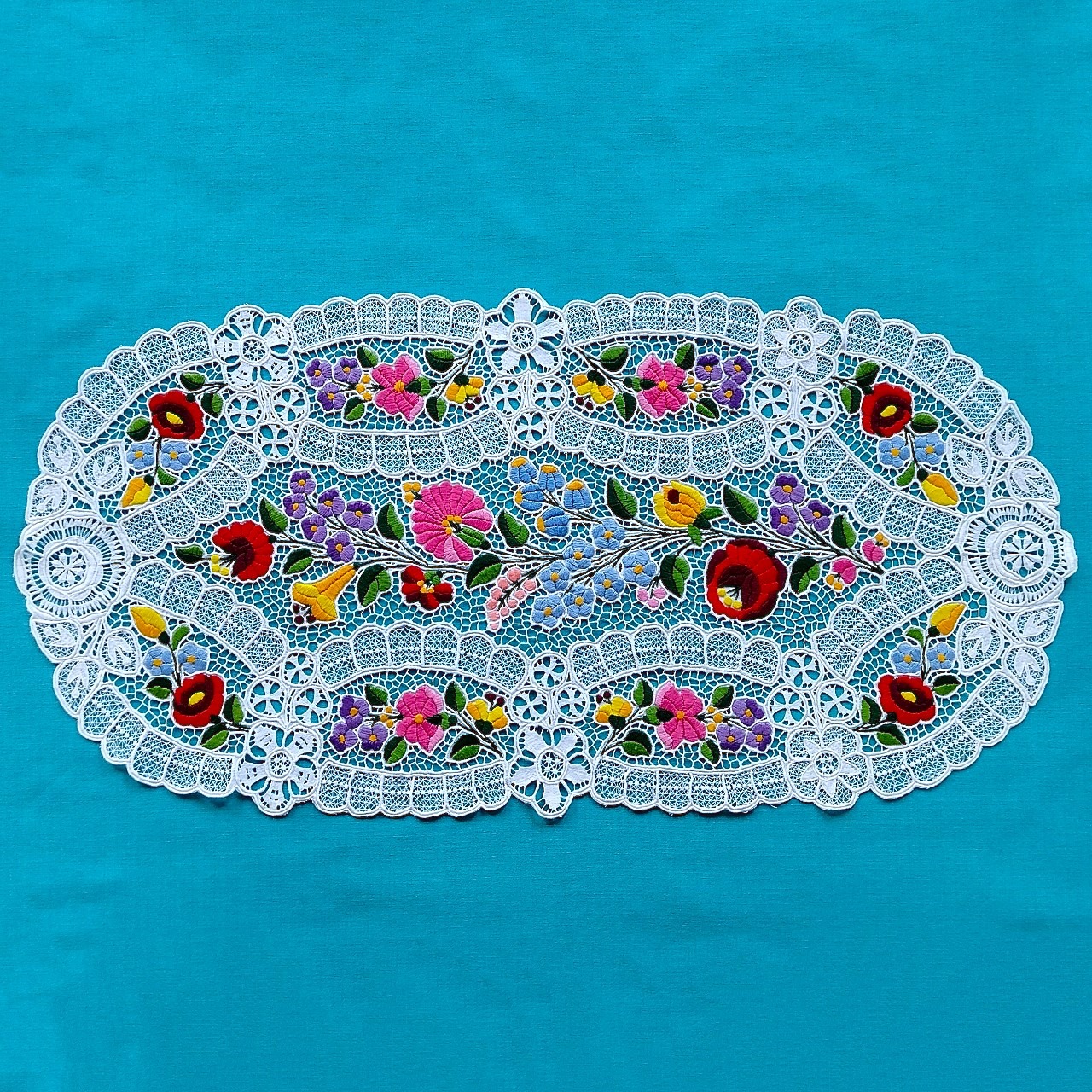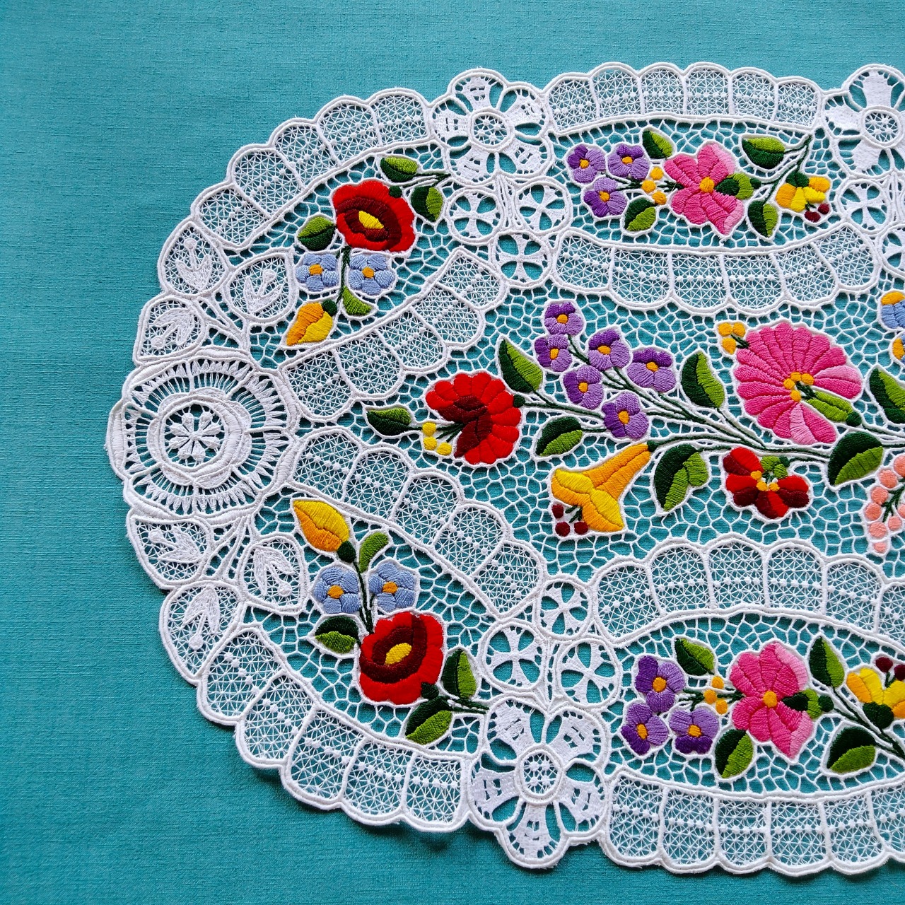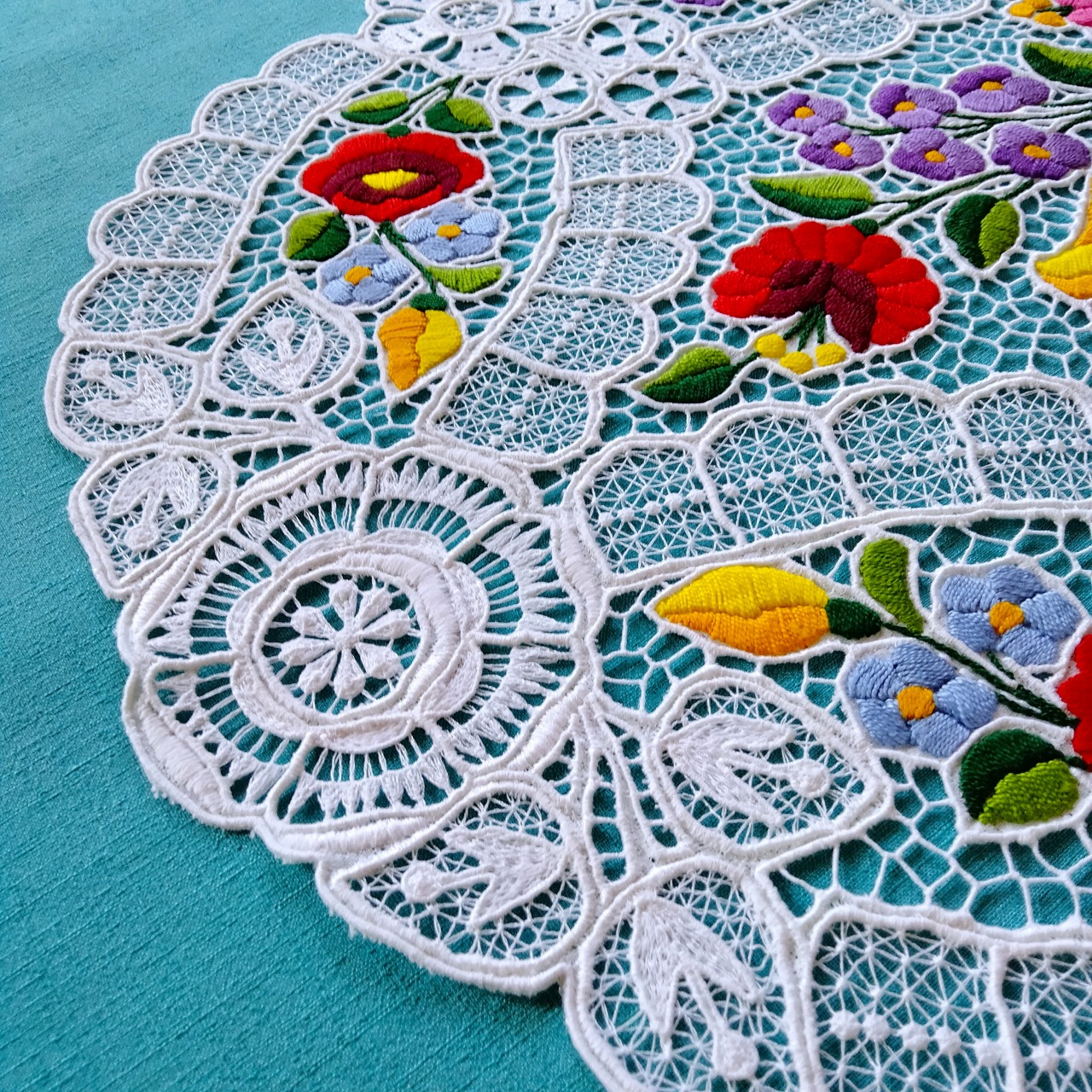 ハンガリーのカロチャの職人による、カロチャ刺繍のレースのオーバルドイリーです。カロチャ刺繍らしいカラフルな花々が手刺繍にて施され、ミシンで編まれた繊細なリシェリュー(レース)が全体に贅沢にあしらわれた美しく希少な作品です。