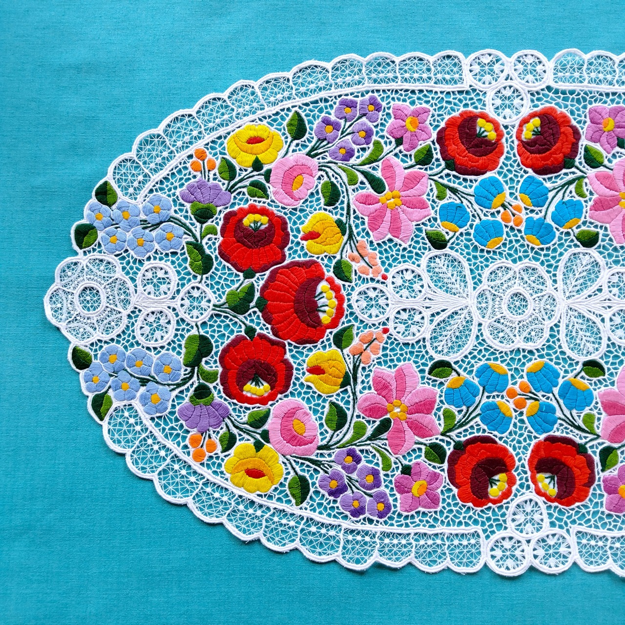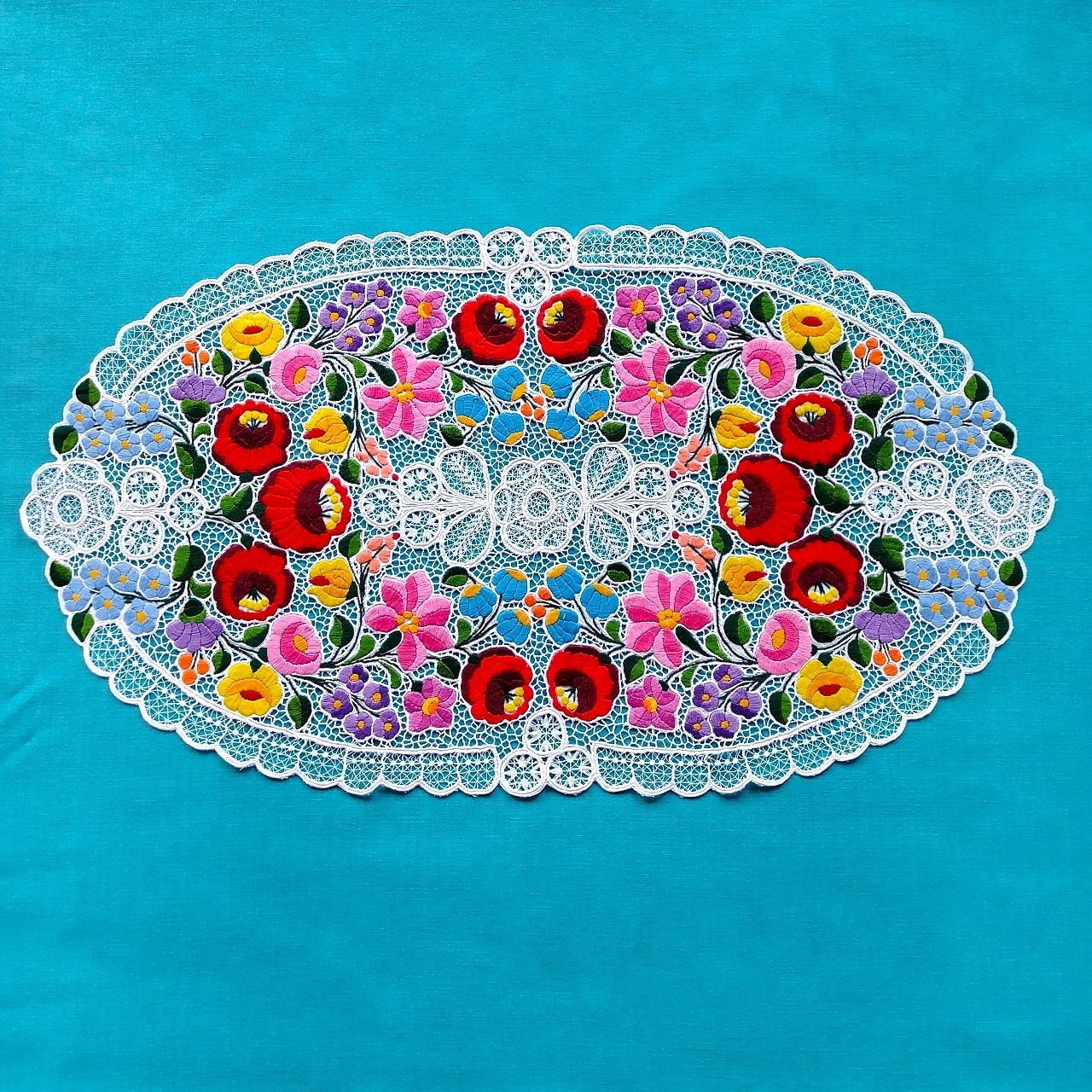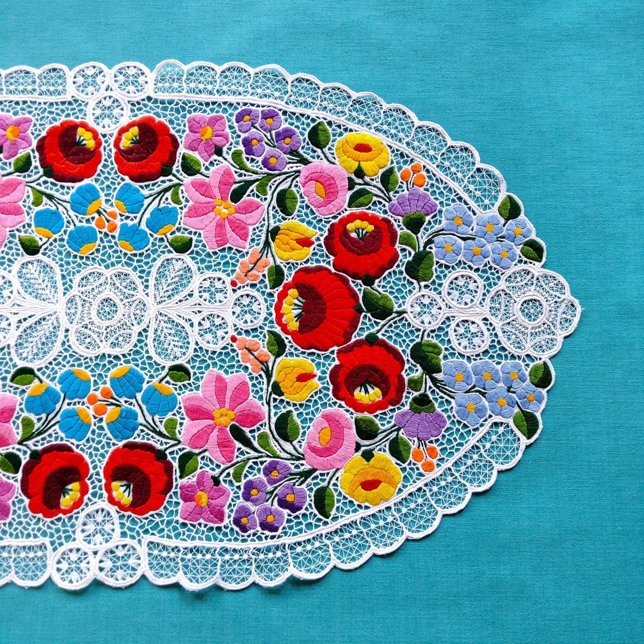 ハンガリーのカロチャの職人による、カロチャ刺繍のレースのオーバルドイリー(87×48cm)です。手刺繍にて贅沢に施されたカロチャ刺繍らしいカラフルな花々と、ミシンで編まれた繊細なリシェリュー(レース)が美しい、大きなサイズの希少な作品です。